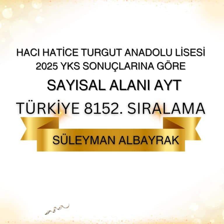 Öğrencimiz Süleyman ALBAYRAK 2025 YKS sonuçlarına göre 8152. olmuştur. Öğrencimizi tebrik ediyor, başarılarının devamını diliyoruz.